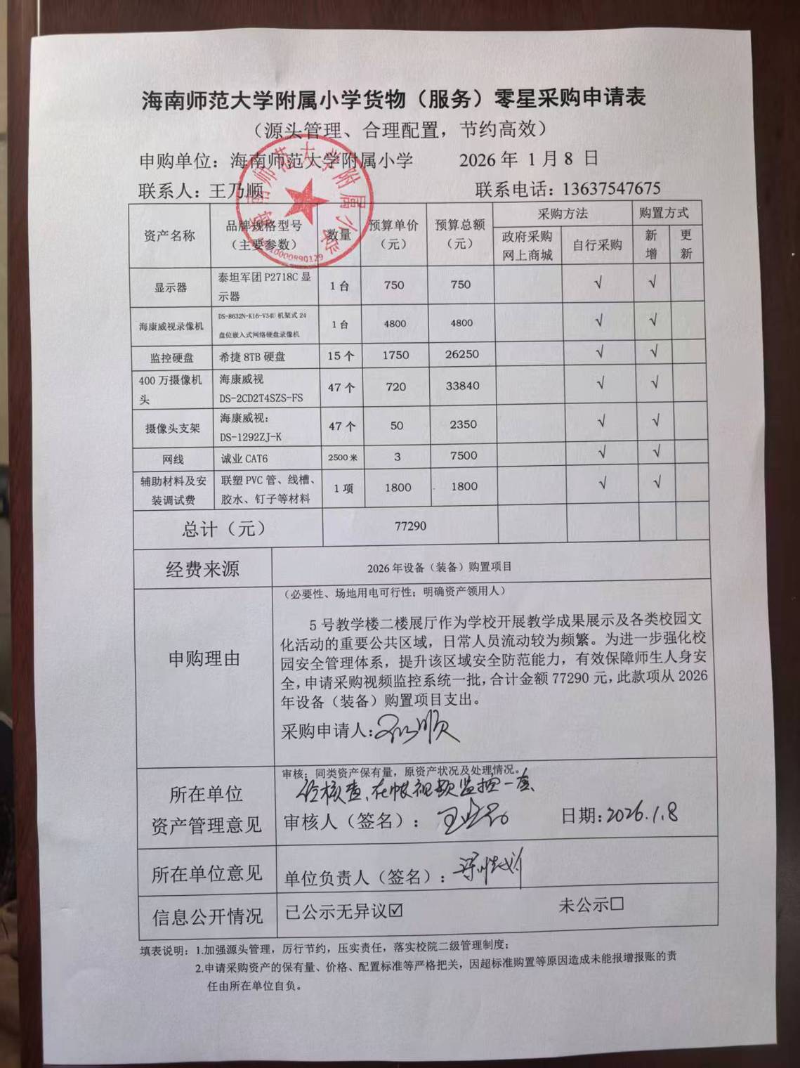 5号教学楼二楼展厅作为学校开展教学成果展示及各类校园文化活动的重要公共区域,日常人员流动较为频繁。为进一步强化校园安全管理体系,提升该区域安全防范能力,有效保障师生人身安全,申请采购视频监控系统一批,合计金额77290元。