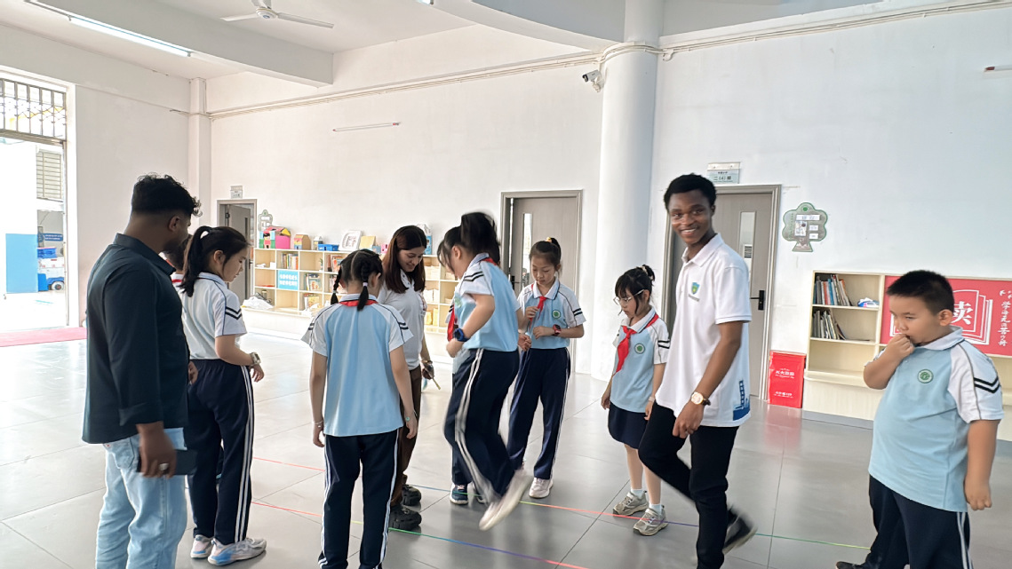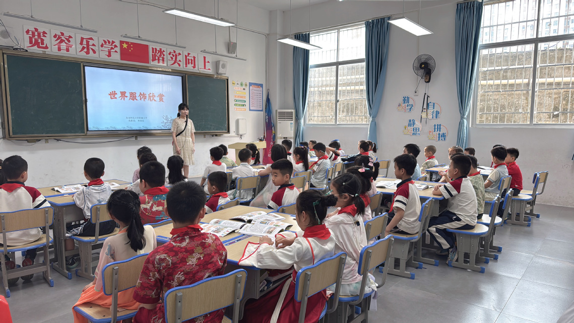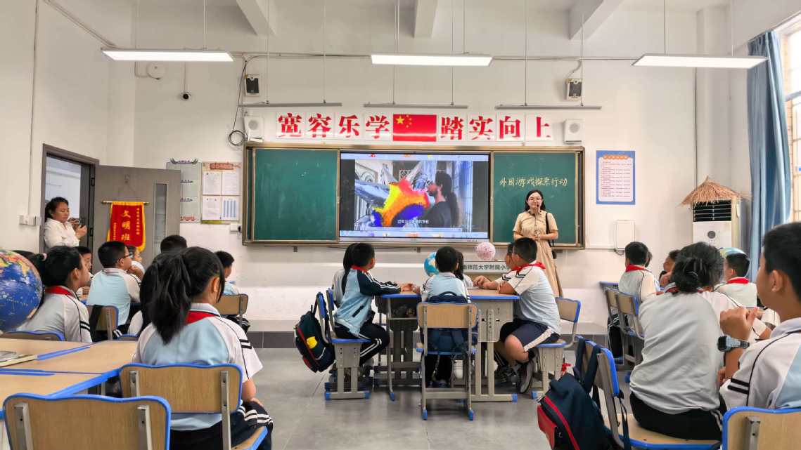 随后,调研组深入课堂观摩展示课。海南师范大学国际教育学院留学生共同参与服饰研究和游戏互动,林莉花老师执教《世界服饰欣赏》,以多元服饰文化为载体,融合审美鉴赏与文化理解,引导学生感受世界服饰之美,培育文化包容意识;黄果植老师执教《我是地球村小公民—— 从游戏看世界》,以趣味游戏为切入点,串联不同国家的经典游戏与文化内涵,让学生在体验中学习、在合作中探究,充分体现 “以生为本、五育融合” 的教学理念。课堂氛围轻松活跃,学生参与度高,获得调研组一致认可。